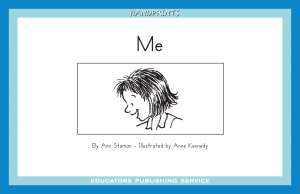 A girl is playing hide and seek with her dog, and shows one body part at a time. The storybook includes two rhyming words. The language pattern is A [body part]. A [body part], culminating in Me!
